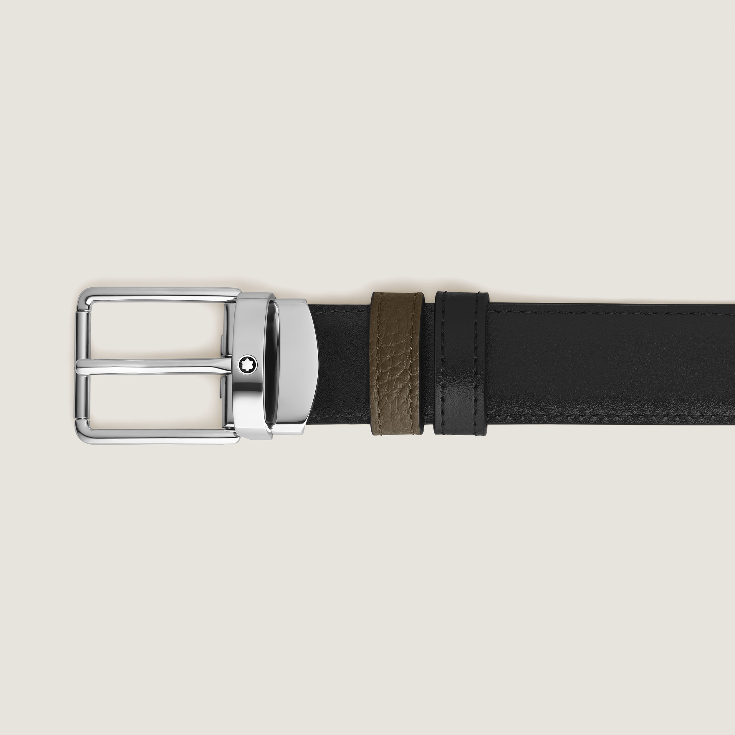 Questa cintura da 30 mm reversibile offre un’eleganza discreta e stile versatile. Un lato della cintura è in pelle granulata in un’elegante tonalità di kaki, mentre l’altro è in pelle Meisterstück liscia nera classica. La fibbia ad ardiglione Everyday, dal ricercato profilo rettangolare, presenta una lucida finitura PVD nera effetto caucciù e bordi puliti con un logo Montblanc discreto intarsiato nella base.