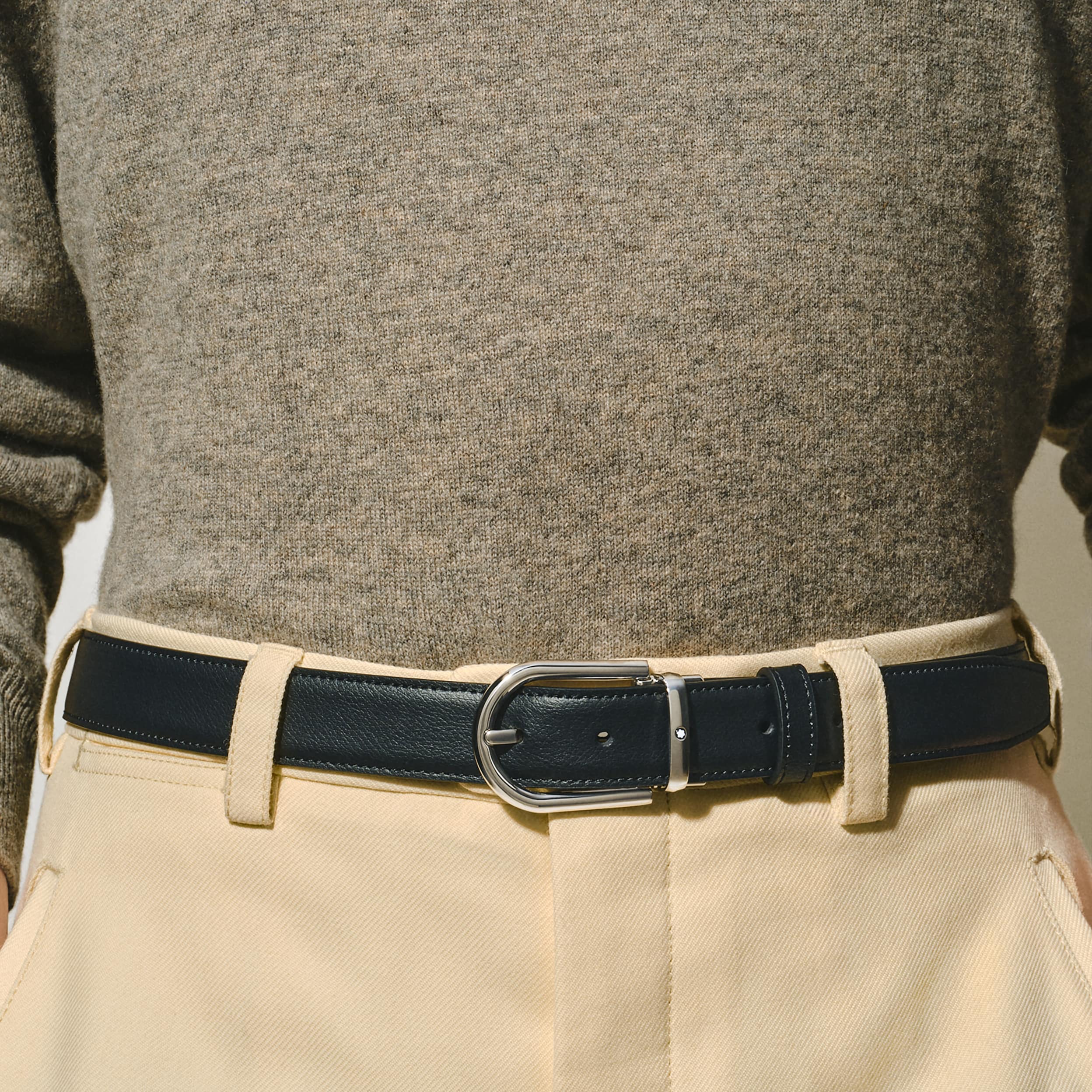 Fibbia ad ardiglione a ferro di cavallo finitura palladio lucido. Cinghia auto-regolabile, 3 cm x 120 cm, reversibile liscia blu da un lato e granulata nera dall’altro. Raffinata e discreta, adatta a qualsiasi look.