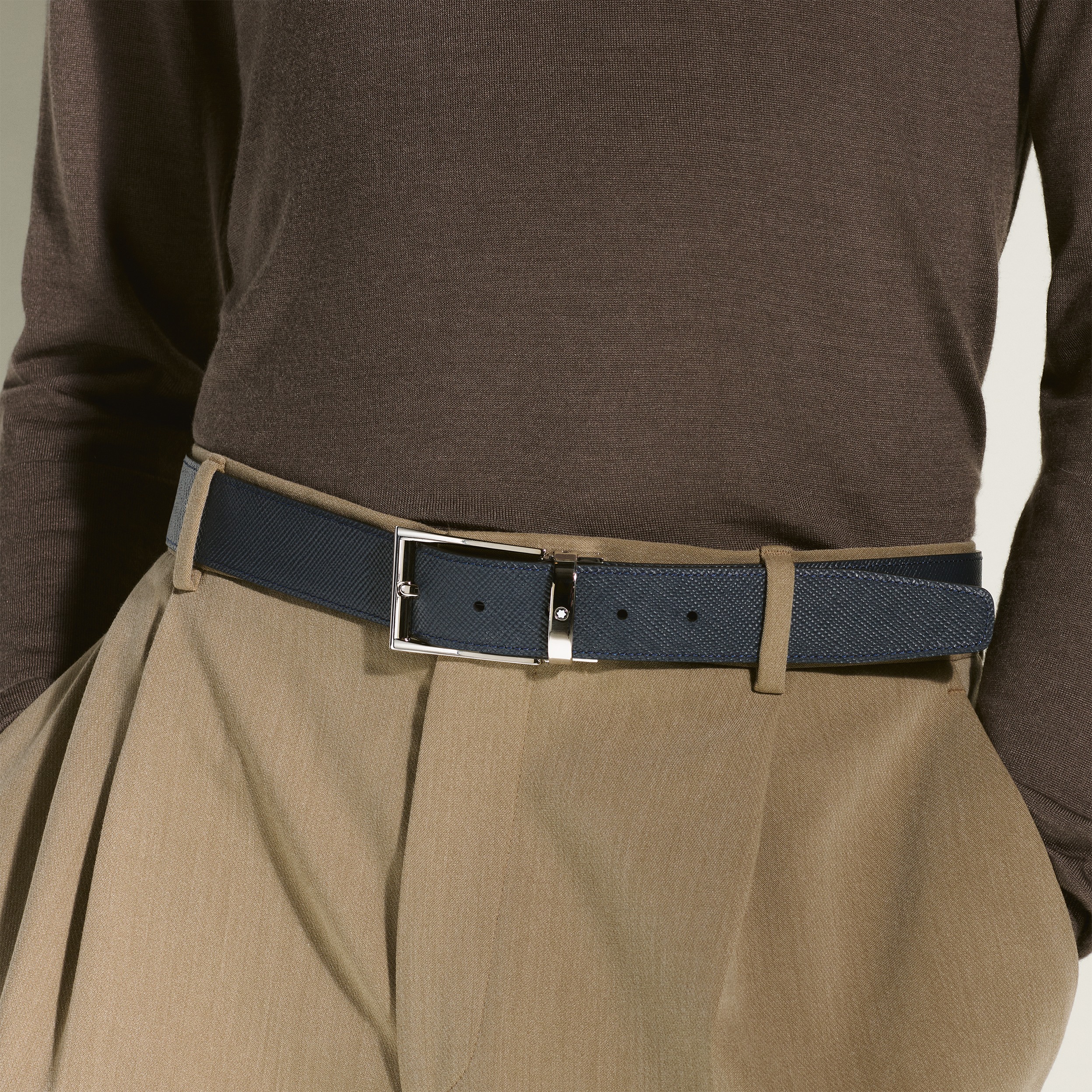 Fibbia ad ardiglione trapezoidale finitura palladio lucido. Cinghia reversibile in pelle nera e blu stampa Saffiano, 3,5 cm x 120 cm, regolabile, da abbinare alla linea di pelletteria Montblanc Sartorial. Questa cintura reversibile ha una fibbia sobria in acciaio pregiato e un’elegante cinghia in pelle di vitello nera su un lato e blu sull’altro: in questo modo si adatta facilmente a un look formale o casual.