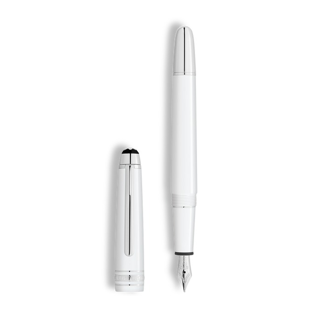 La stilografica Meisterstück Classique in preziosa resina bianca con eleganti dettagli finitura platino, coronata dall’emblema Montblanc bianco intarsiato nella parte superiore del cappuccio, diventa un’icona dal design unico. È corredata di un pennino realizzato meticolosamente a mano in oro massiccio Au 585 finitura rodio.