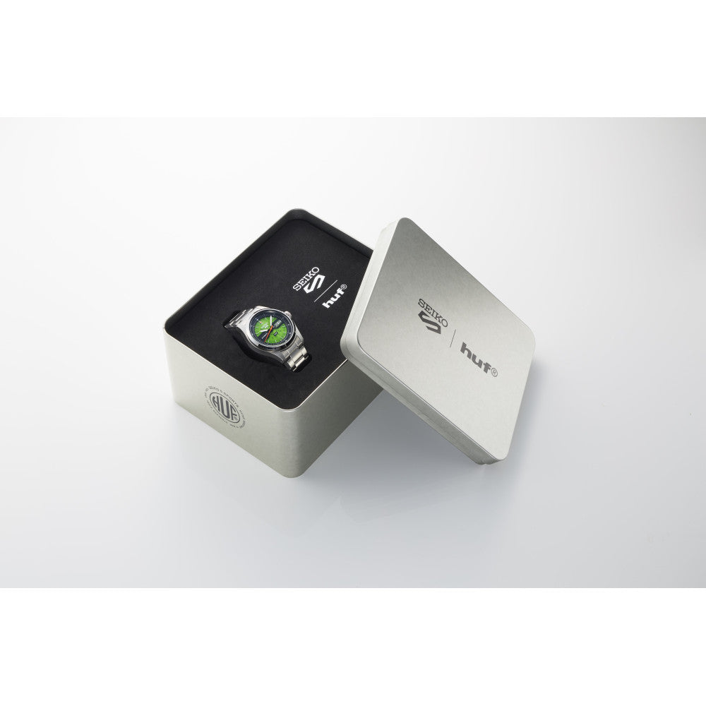 Ispirato a un modello Seiko dโarchivio degli anni Settanta, conosciuto come Time Sonar, questo orologio in edizione limitata reinterpreta unโicona del passato attraverso lo stile distintivo di HUF, fondato nel 2002 dallo skateboarder professionista Keith Hufnagel e oggi punto di riferimento nel panorama lifestyle legato allo skateboarding e alla cultura di strada. Basato sulla serie Seiko 5 Sports Field, il segnatempo si distingue per lโesclusivo colore โHUF Greenโ, simbolo della filosofia del brand, protagonista di un quadrante semi-trasparente che introduce una combinazione cromatica inedita rispetto al modello dโarchivio originale, creata appositamente per questa collaborazione, con il logo โhufโ posizionato alle ore sei. Il fondello a vista riprende la stessa tonalitร verde ed รจ impreziosito da una grafica ispirata a San Francisco, cittร in cui HUF รจ stata fondata, ed รจ inciso con la dicitura โLIMITED EDITIONโ e un numero di serie individuale a sottolinearne lโesclusivitร . Lโorologio รจ presentato in una speciale scatola in acciaio inossidabile e viene accompagnato da un panno originale dedicato alla collaborazione Seiko x HUF, unendo heritage orologiero e spirito street in unโunica creazione di carattere.
